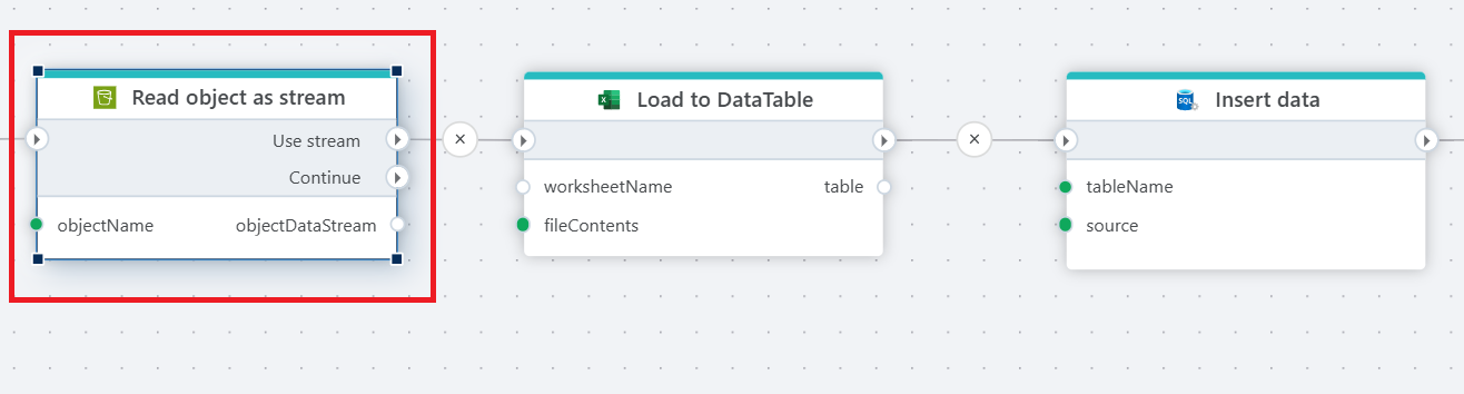 The flow reads an S3 object as a stream, loads the data into a DataTable, and then inserts it into a database.