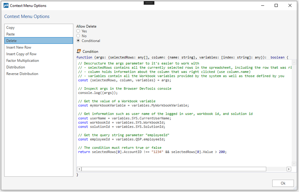 You can now specify conditions for whether a context menu option should be available to the user or not. That enables context menus to be rendered dynamically based on information from the clicked row(s) and the state of the Workbook.