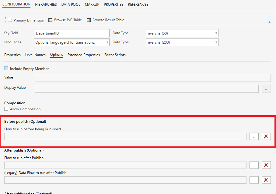Support for running custom JavaScript when items are added to a dimension tree in the Dimension editor UI. This enables scenarios such as setting good default values for properties when a new dimension member is added. Read more here. Support for running a Flow before a dimension is published. This enables validating a dimension before it is published to production or other Work Process Versions.