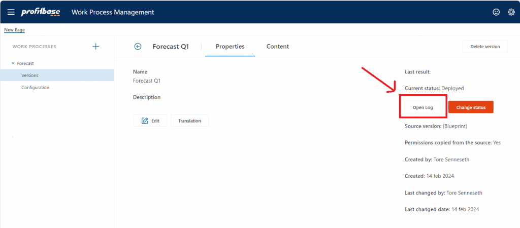 You can now view the log of the previous status change operation (Deploy, Open, Close) of a Work Process Version. This makes it easier to review any issues during the operation later.