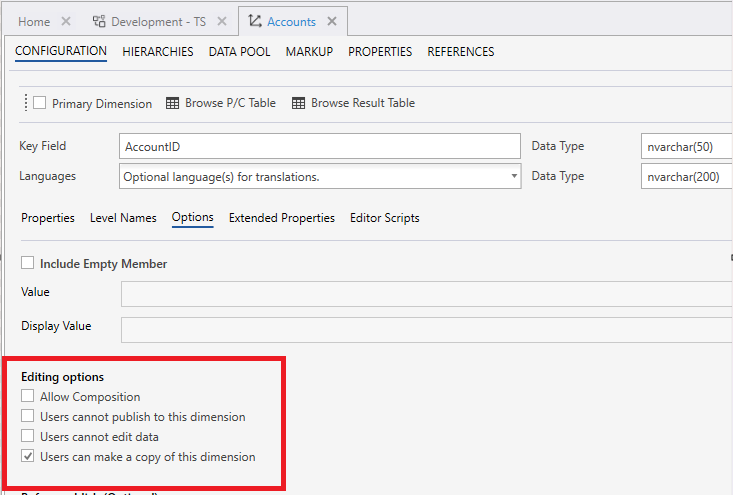 - Whether or not users can make a copy of the dimension from the Dimension Editor. You can determine whether enabling this option aligns with your solution’s requirements.